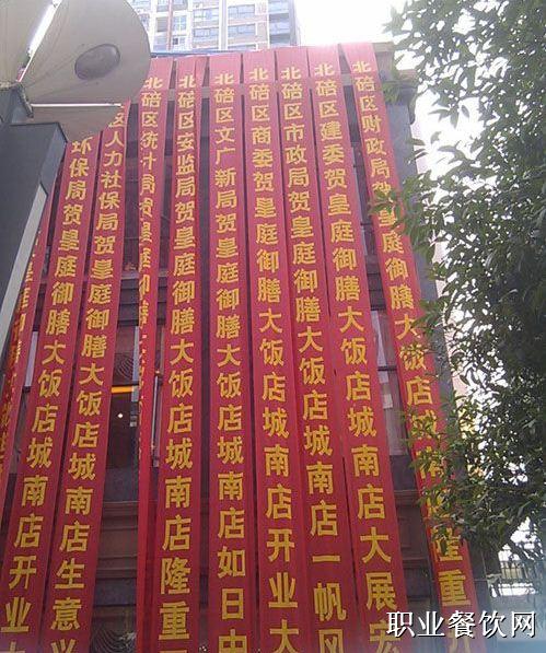 国庆节期间,重庆北碚新区(北碚城南)步行街一酒楼新开张。在酒楼的门面,从上至下,悬挂着包括当地财政、市政、工商等数十个政府部门的百余条祝贺条幅。店员称,这家饭店属“重庆黄老邪饮食文化有限公司”旗下,除饭店外,该公司还开设有一间酒楼和一家咖啡店,在当地小有名气。