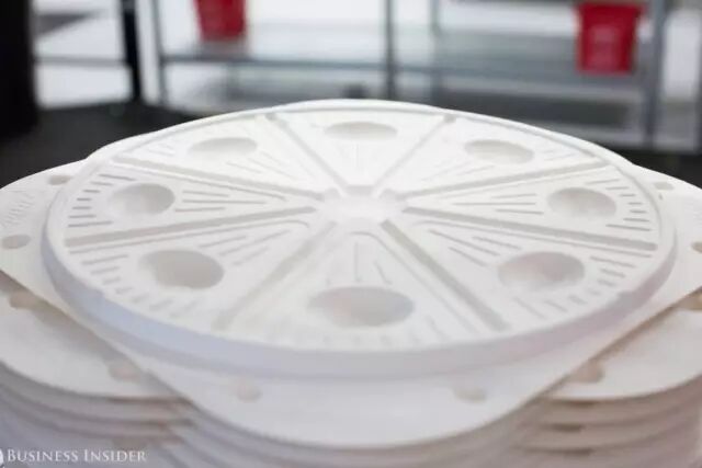 第七步:放入特制的盒子中,该盒子有呼吸孔和导水槽可保持其脆口感,避免因水蒸气让披萨变软。