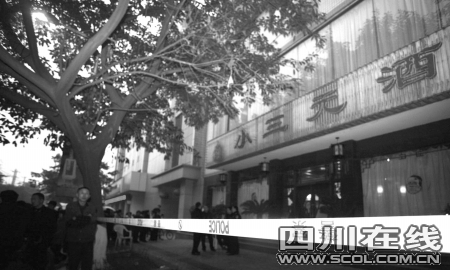 昨天晚上,记者来到案发现场广汉市湖南路一段12号小三元酒楼外。数名警察站在酒楼外的警戒线内,酒楼的大门半开着,被砸烂的瓶瓶罐罐散落一地。