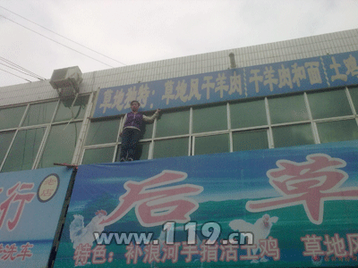 15时02分左右,中队救援人员到达现场, 特勤二中队的随后赶到。到场后经过了解后得知,位于饭庄二楼的一名服务员站在广告牌上一手抓着头顶上的广告牌,在来回的走动,情况十分危险。中队长武平虎 立即带领特勤班长金智国前往二楼准备实施救援,楼下的特勤二中队人员负责保护和现场警戒,中队的其他人员在楼下负责安慰跳楼人员的情绪防止发生意外,随后 中队长武平虎和金智国到达二楼打开了两边的窗户,趁着服务员的不注意,中队长猛然一下双手抱住了服务员的双脚,金智国顺手将中队长和服务员一把拉进了房 间,成功的将服务员救了下来。