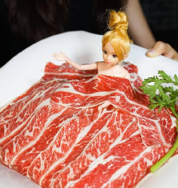 其实在火锅行业,摆盘现在处于两个极端,一边是简单朴素的实干派,毕竟东西最后都是要往里倒的,所以餐具和摆盘呈现以高效方便为第一原则;另一边的主要目的是创造爆炸性的视觉效果,比如曾经红火的巴不得用冰块雕出金山银山的海鲜姿造,又比如一度成为网上热图的芭比娃娃羊肉礼服。