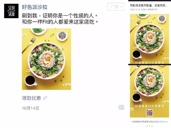 好色派沙拉采用了腾讯社交广告的朋友圈本地推广广告。其外层以有强身份认同感的文案,提升了广告互动率,而内层则会跳转到微信卡券领取的页面,带动消费者到线下门店消费。基于卡券的实际核销率,好色派还得对广告的投放效果进行追踪和评估,进一步优化未来的广告投放方案。这条本地推广广告最终为好色派带来了 20 万元的收入。