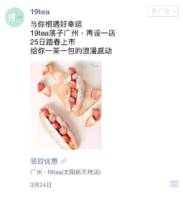 跟小蹄大作的情况一样,广州一家主打“鲜果茶 + 软欧包”的烘焙饮品品牌 19tea 也在快速开店,且同样借助了腾讯社交广告的 LBS 定向能力,不同的是,它不只是希望基于不同门店的位置找到周边顾客,更希望招揽到更多潜在消费人群。