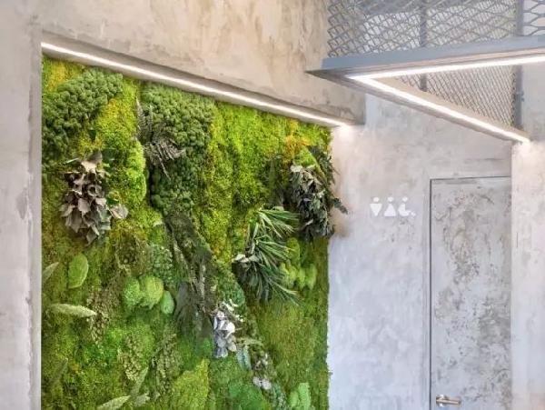 为了给这个空间增添更多的自然元素,设计师还设计了绿墙,里面填满了苔藓(能作为监测空气污染程度的指示植物)。
