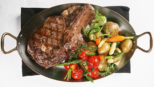 扒顶级澳洲安格鲁斯带骨牛排配百里香小土豆和烤时蔬佐奶油汁和黑胡椒汁(福楼出品)
