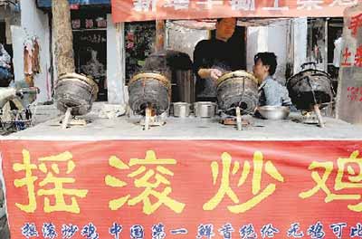 在康复后街的菜市场内,有一张姓厨师发明了一种机器,一次可以摇动4个炒锅,能同时炒出4盘味美的炒鸡,他还为自己的门面起了个别致的名字:“摇滚炒鸡”。