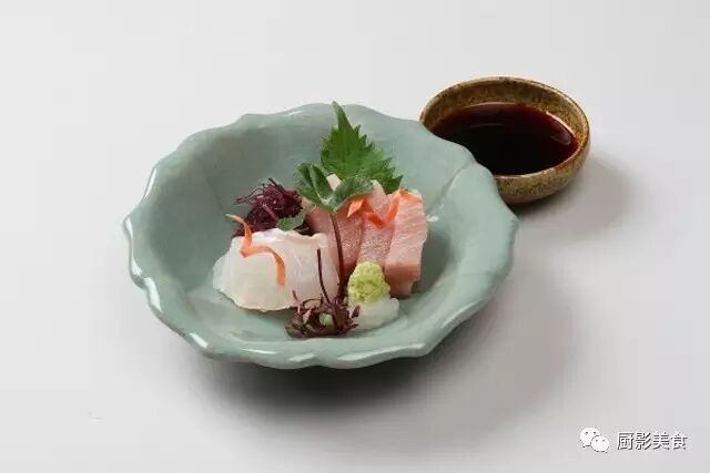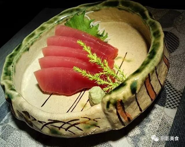 金枪鱼刺身,以白萝卜切丝作为垫底,衬以大叶,在日料中做装饰使用的通常为青紫苏。