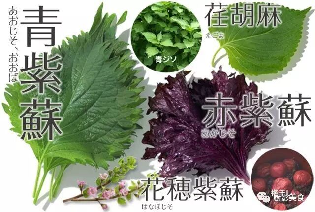 紫苏,日语中称为紫蘇或者是シソが大葉に。紫苏是日料中最为常见的装饰品,在食用刺身或寿司时经常可以见到。