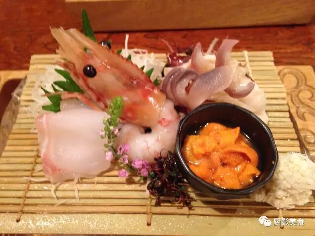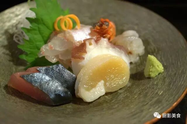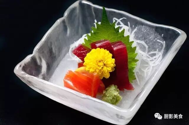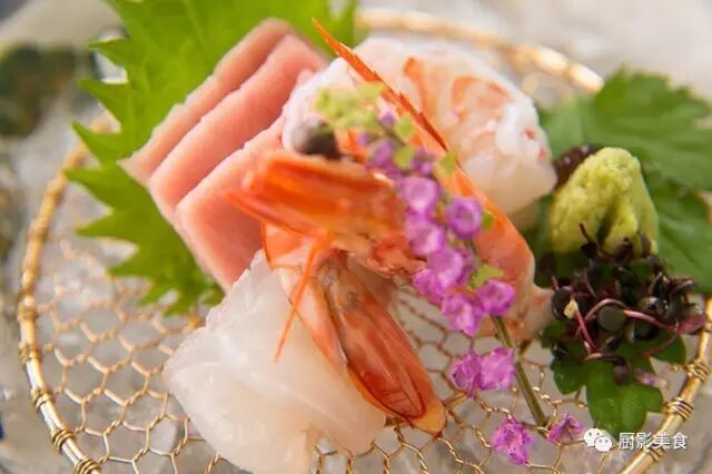 看看紫苏花穗在刺身中的点缀效果是这样的。这道菜品分别用了紫苏花穗,绿枫叶,小菊,青紫苏(大叶),芥末,海藻等进行了装饰,