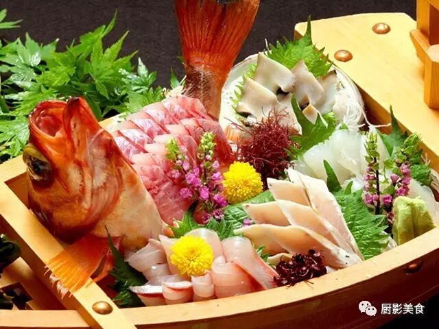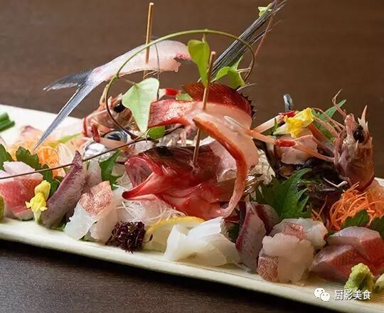 图为怀石料理以山药叶进行装饰的刺身生鱼片姿造