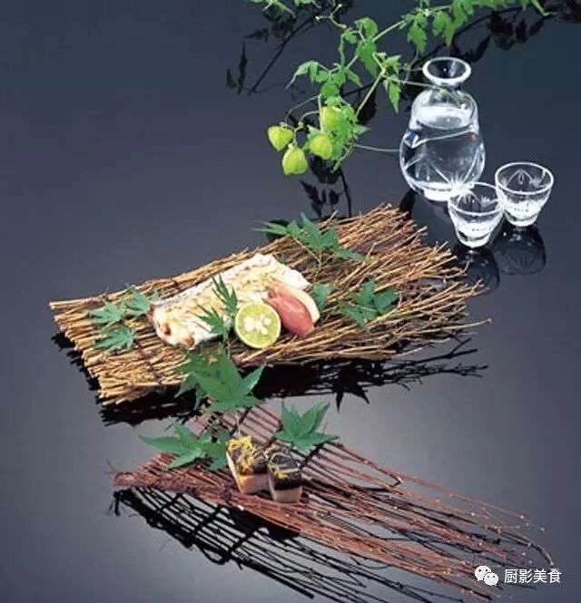 深秋时节,金黄的银杏叶夺人眼球,让人感叹秋色正好。而一片片小小的叶子形如扇形,精致小巧,惹人喜爱。对于美丽的食物都极为敏感的日本人当然绝不会放过这绝好的装饰品,在摆盘时加入一片,看似随意,却能极好的烘托出秋季的氛围,起到画龙点睛的效果。