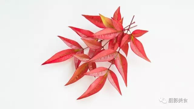 即红色的南天竹。分为大中小号,南天竹因为在日语中的发音和“扭转困境”近似,因此常常用南天竹的叶子来装饰盐烤鲷鱼及红豆饭等用来庆祝的料理。不懂这些,就无法在真正意义上理解日料摆盘与装饰的艺术。