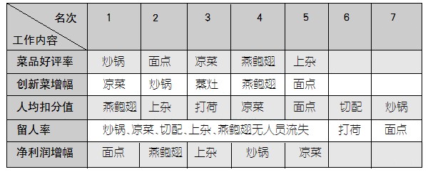 常州德群大酒店的厨房每月初会将上月各档口的工作成绩排个名次,内容包括:各档口菜品好评率、创新菜增幅(当月被酒店选中的创新菜数减去上月被选中创新菜数所得的数值)、人均扣分值、留人率以及净利润增幅(当月净利润减去上月净利润所得的数值)。