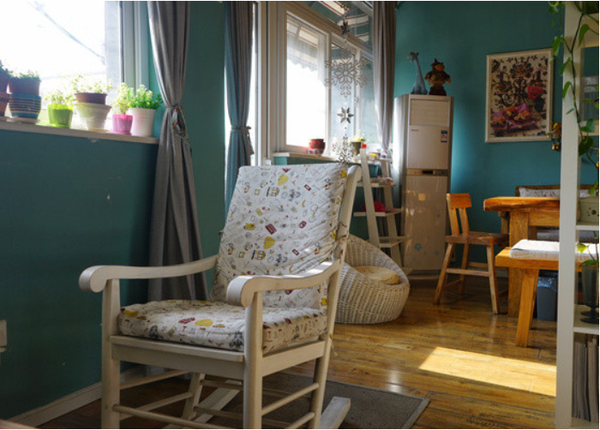 餐厅在没有单一色,耳目一新的地中海蓝,阳光花园里的摇椅,办公室里的木质长条桌,碎花面的欧式沙发,放着几本书的简易书架,西式的酒吧吧台,欧美流行的吊灯,咖啡机、咖啡豆等等,都成了餐厅不可或缺的元素。每一个个餐位就是一个小空间,每一个小空间就是一种不一样的景色,不同的风格融合到一起成了餐厅的不同体验。
