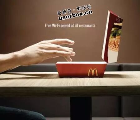 下面这个设计将一口大小的食物放在叉子上,表现了薯条牛排的特色。这会让你自然的联想到自己吃牛扒的场景。