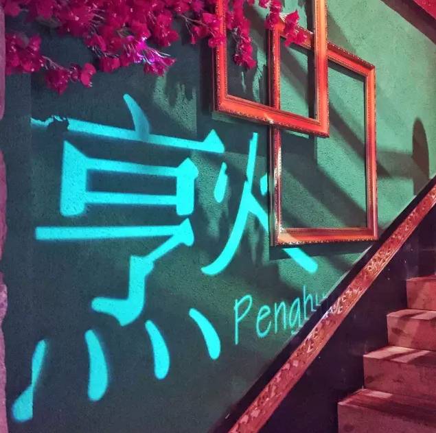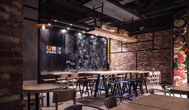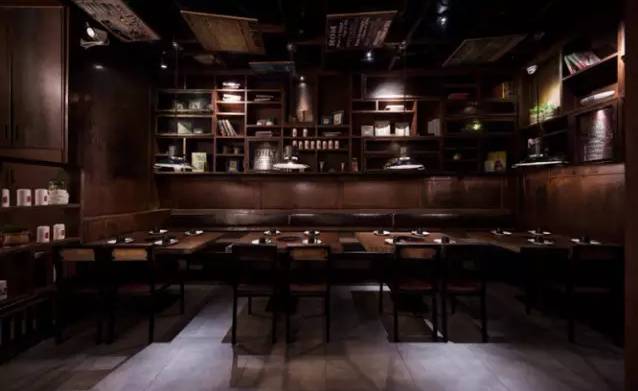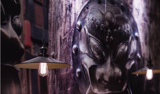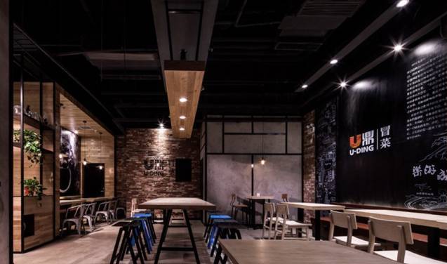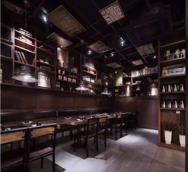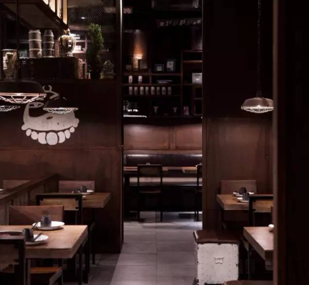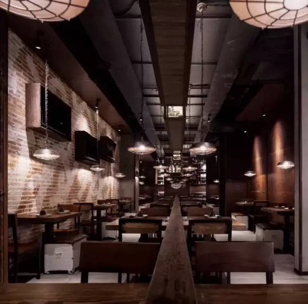 这家店主打工业风,原木色门头上的黑字白底的LOGO十分鲜明。怀旧斑驳的木材和大量极具现代工业感的灯饰、桌椅进行碰撞,加上红砖水泥元素墙面,形成强烈的视觉反差和冲击。黑色手绘板和装饰墙又增添了一丝民族风,而这种混搭毫无违和感。