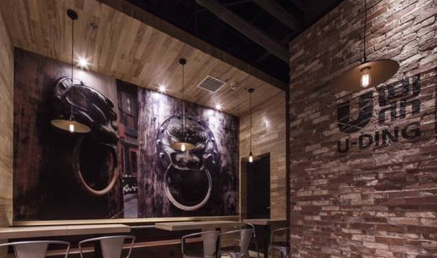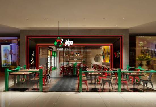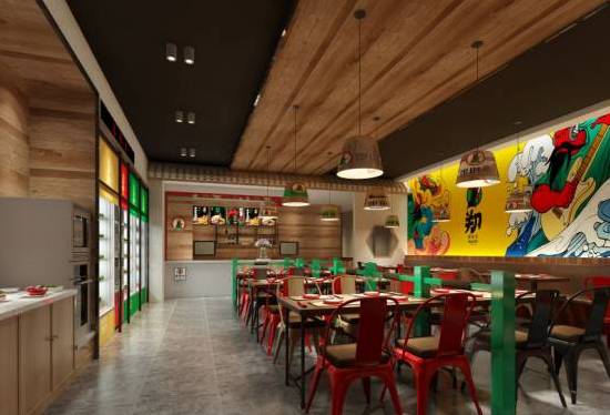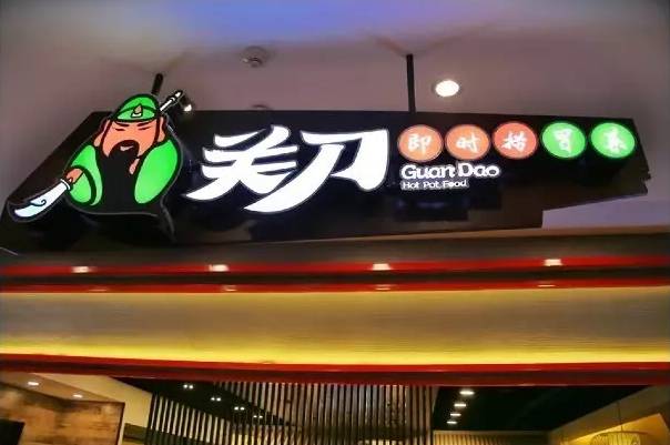 这家店以四川历史人物关公为主题,LOGO为Q版人物,加上店内大量的关公插画和京剧脸谱等相关传统元素,将品牌特色十分鲜明地表现出来。而店内具有现代感的器具、桌椅和灯具也将现代感与传统做到了很协调的融合。