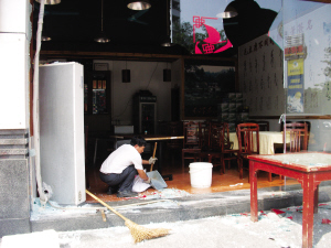 湖南大碗菜的店被砸,店员正在清扫玻璃碴 东莞时报记者 邓志高摄