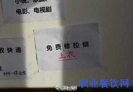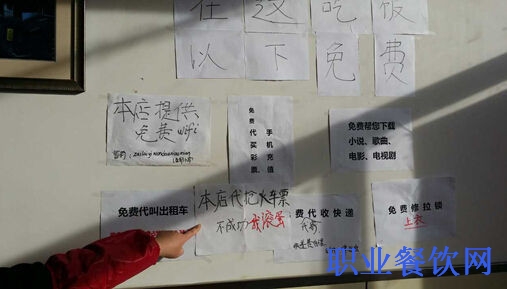 问及走红原因记者得知,老板娘是个热心肠,今年入冬店里有个客人衣服拉锁坏了,老板娘就拿出自己的家伙免费帮忙修理,看到店里的人喜欢在吃饭时玩手机,又搬来了一台电脑提供了免费wifi。随着店里的客人的与日俱增,不到两个月这一张张温情脉脉的免费海报,便密密麻麻的贴了满墙。看年底春运浪潮正猛,老板娘又推出了用手机代抢火车票的服务,竟还真的引来了附近不少慕名而来的民工。