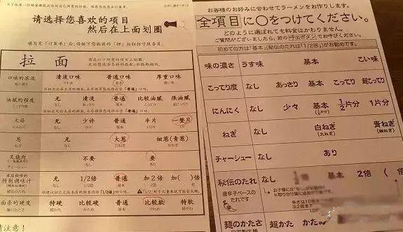 在一兰吃拉面,服务员会递给你一张纸,纸张上面写着:口味的浓淡、油的程度、大蒜、葱、叉烧肉、特制调味汁、面条的硬度等等,顾客只需要在表格里面打O,便可以自己决定自己拉面的口味。
