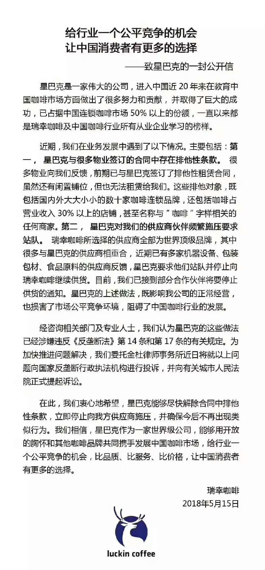 就在昨天(2018 年 5 月 15 日),瑞幸咖啡发布了一封给星巴克的公开信。