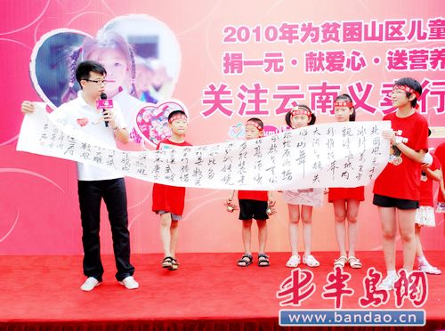 8月12日,在青岛市浮山后四小区步行街上,一群来自浮山新区的小学生们举行了一次特别的义卖活动,义卖品都是学生们利用废品制作成能够再利用 的小物件,义卖所得的款项将全部用于为云南贫困山区的小学生们的营养加餐。这次义卖行动是由中国扶贫基金会携手肯德基、必胜客所属百胜餐饮集团中国事业 部、联合国世界粮食计划署共同发起的2010年为贫困山区儿童“捐一元•献爱心•送营养”项目的一次公益活动。