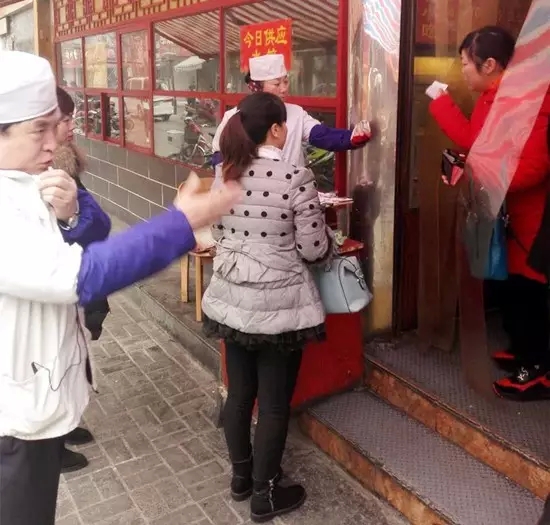 旁边有个专门收票的服务员负责喊号,票上写“三两”,他就喊“三两”,厨师听了,就铲起锅贴装盘递给食客。