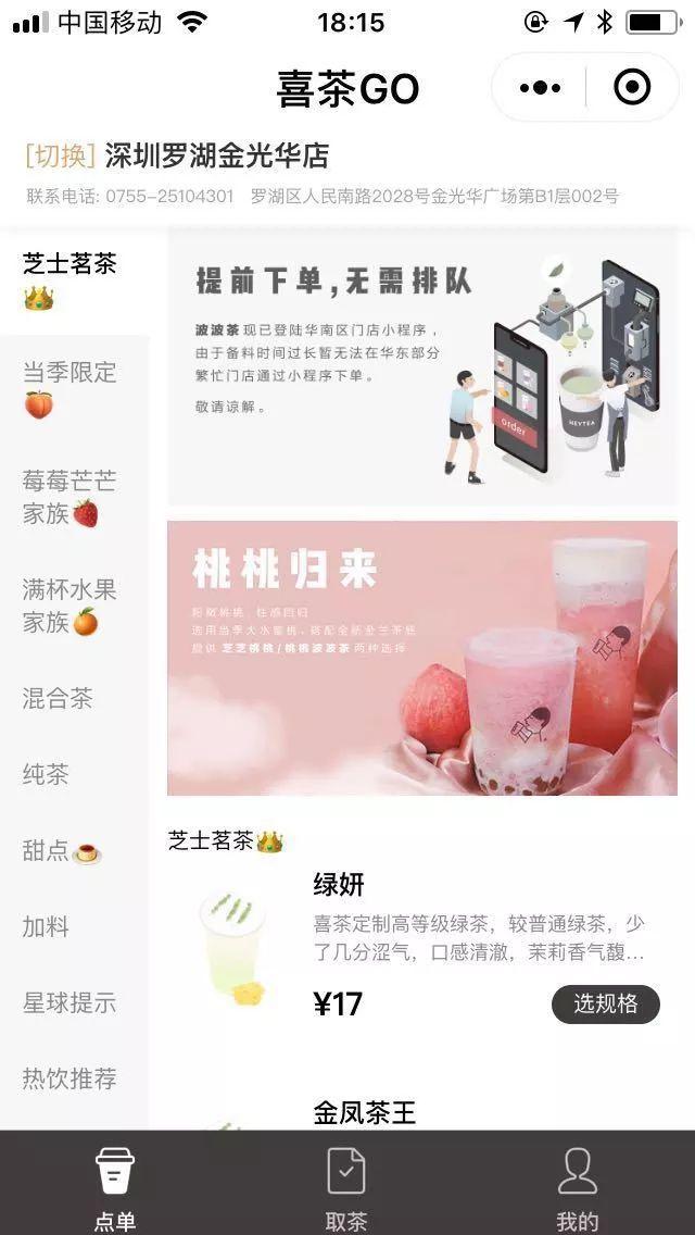 对于喜茶来说,便利性是他们客户的自然趋向,也是品牌目前着力希望满足的客户需求。 2017 年 9 月,喜茶上线了官方小程序开始售卖品牌周边,而 2018 年 3 月,喜茶新推出的全新小程序“喜茶GO”,开始支持点单功能,这是 3月开始的数字化升级的一部分。