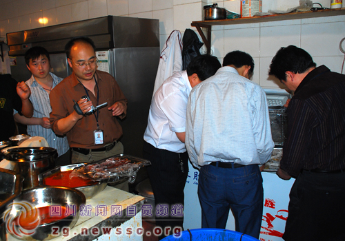 下午4时记者跟随自流井区林业局执法大队执法人员来到该火锅店,走进火锅店几名店员忙上来打招呼,林业执法大队执法人员向店员表明身份后,在店员的带领下来到火锅店厨房。