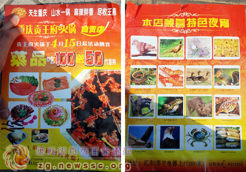 位于自贡市汇东新区的重庆贡王府火锅自贡店,在菜单上向食客推荐小煎松鼠、清炖老鹰等菜品,记者接到群众报料后,对此展开了暗访,随后将得到的信息向自贡市自流井区农林执法大队举报,16日下午,自流井区农林执法大队对该店销售野生动物的行为进行查处。市民举报:火锅店在卖野生动物