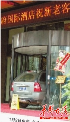 1月2日中午,长沙湘府国际大酒店,肇事越野车被卡在自动转门上