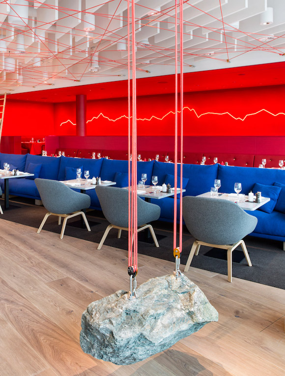有一面用德语写着“湖上的冰”的“玻璃墙,玻璃里铺着满满一层海盐;有一面挂满了瑞士火车站时钟的墙,每个钟指示一样的时刻,但标牌上却写着瑞士境内不同的航空观测点;还有一面墙与天花板共同组成了攀岩主题墙,墙上的大小不一的石块和天花板上用红色登山绳织出的网让人想到瑞士户外运动的兴盛——对了,从天花板里还挂下了两簇红绳,它们吊着一块大石头,成了一架选在餐厅中央的秋千。