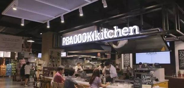 Peacock Kitchen的品牌理念是life delicious(美味生活),消费者在此可以享用到市面上知名餐企和地区的特色菜品。它是一家同时销售食材和餐饮的综合卖场,在这里仿佛身处一个高逼格的“大卖场”。