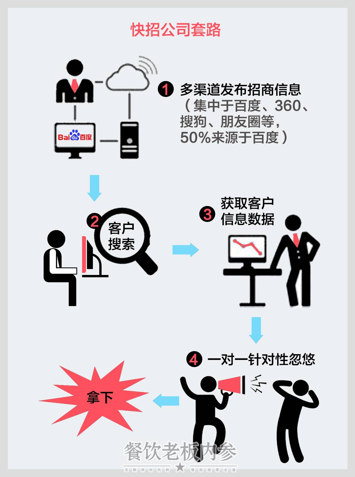 前不久,内参君接触到一家快招公司(相关阅读:深喉自爆:你看到的餐饮加盟商机,70%都是他们精心设计的局!),该公司负责人表示,他们往往会在搜索引擎上发布招商信息,客户主动搜索后,他们就会获取客户的信息,然后通过数据分析,获得这些客户的联系方式、姓名、地址、店铺……基于这些信息筛选出相对有价值的用户,然后集中突破。