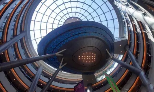 in ART space,横跨3到7层的巨大火炬形艺术空间,美轮美奂,寓意创世和光明,由英国BENOY设计完成。表面由LED组成,可播放巨型视频动画;火炬内将作为艺术设计展览平台。
