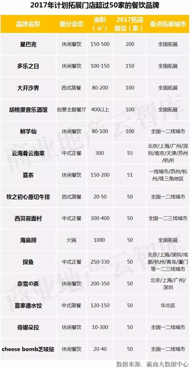 【左庭右院】、【玩者火焰薄饼】、【奈雪の茶】、【牧之初心原切牛排】、【Max&Salad大开沙界】都进入了前20位,其捕捉到各自细分品类的市场空白,入市后不断培育自己,【奈雪の茶】、【牧之初心原切牛排】和【Max&Salad大开沙界】2017年更计划拓店50家以上。