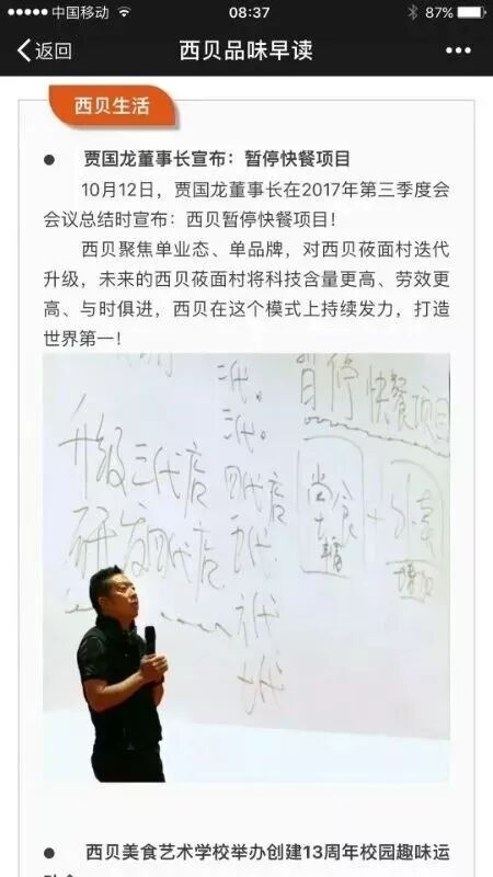 总之,不管怎样,断臂需要勇气,不拖泥带水,承认失败,直截了当,证明贾总是条真汉子!相信贾总,相信西贝,只要给点时间,相信西贝帝国有足够的能力、勇气和智慧,重新启动快餐项目,绽放新的光彩,向世人交出一份精彩的答卷来!