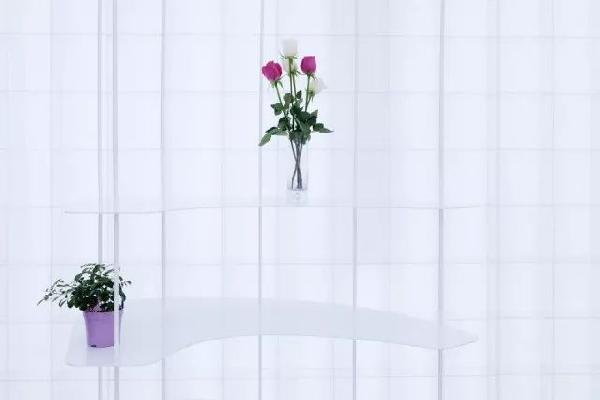 弧形的展示架层层叠叠地向上,轻薄的材质让它像是飘在空中,人们的视线随着展示架向上延伸,最终消失在屋顶明亮的白色里。