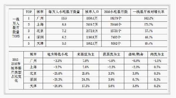 地方特色小吃作为小吃产业的重点类型,在全国各地都有分布。而一线城市每万人餐厅数量排行分别为广州、上海、北京、深圳、天津;其中,上海较其它一线城市的小吃业态网点增长率较高;五个一线城市中,地方特色小吃均有下降,而米/面/豆类小吃均有上升。其中,深圳在地方特色小吃类型的下降幅度最大,而在米/面/豆类小吃的上升幅度较大。