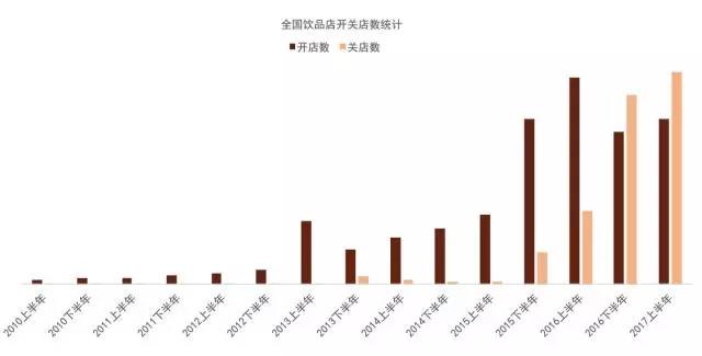美团点评数据显示:从2015年下半年开始,半年饮品店关店数逐渐增加,2015年上半年关店数比开店数甚至还多出了28%。