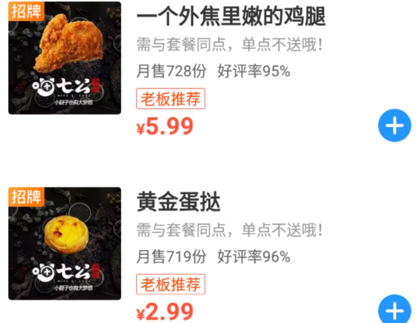 菜单设置是喵七公做的比较成功的地方,并帮助品牌获得了高额转化率。菜单方面可供外卖品牌借鉴的地方,包括高颜值的菜品图片、套餐设置、特价小食等。