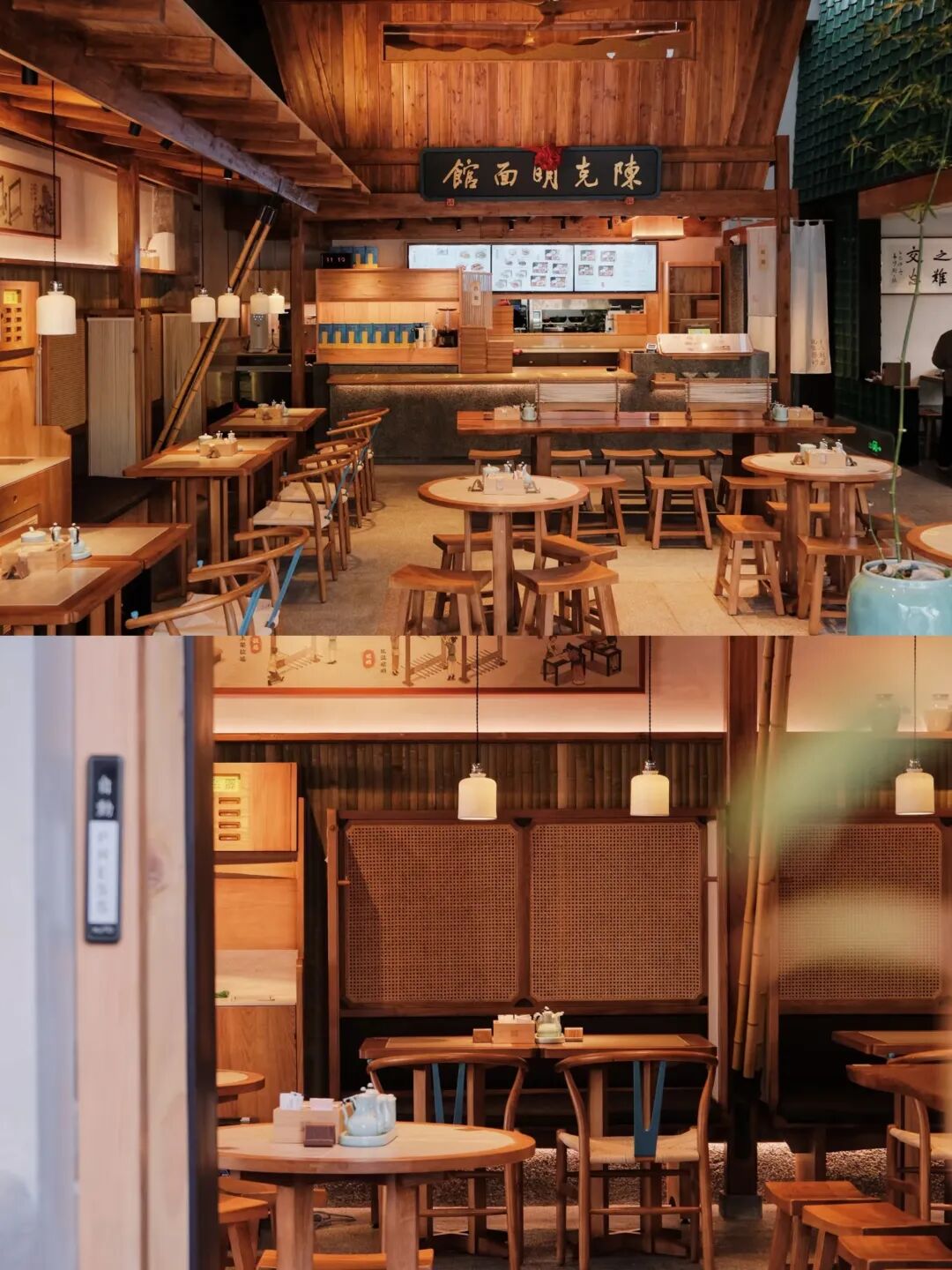 门店布局上,陈克明面馆并未沿用传统面馆的简约装修,而是采用新中式与市井烟火融合的设计风格,将木质结构与墨绿釉面瓦砖进行冷暖碰撞,既保留了烟火气,又提升了门店的整体质感。