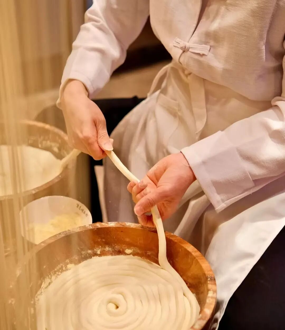 值得一提的是,入口右侧,店铺还专门设置了明档手延面制作区。这一设计,不仅让食客在开放式用餐区就能直观看到师傅现场手工制面的全过程,也能吸引往来的路人驻足,让制面工艺展示成为店内的视觉焦点。
