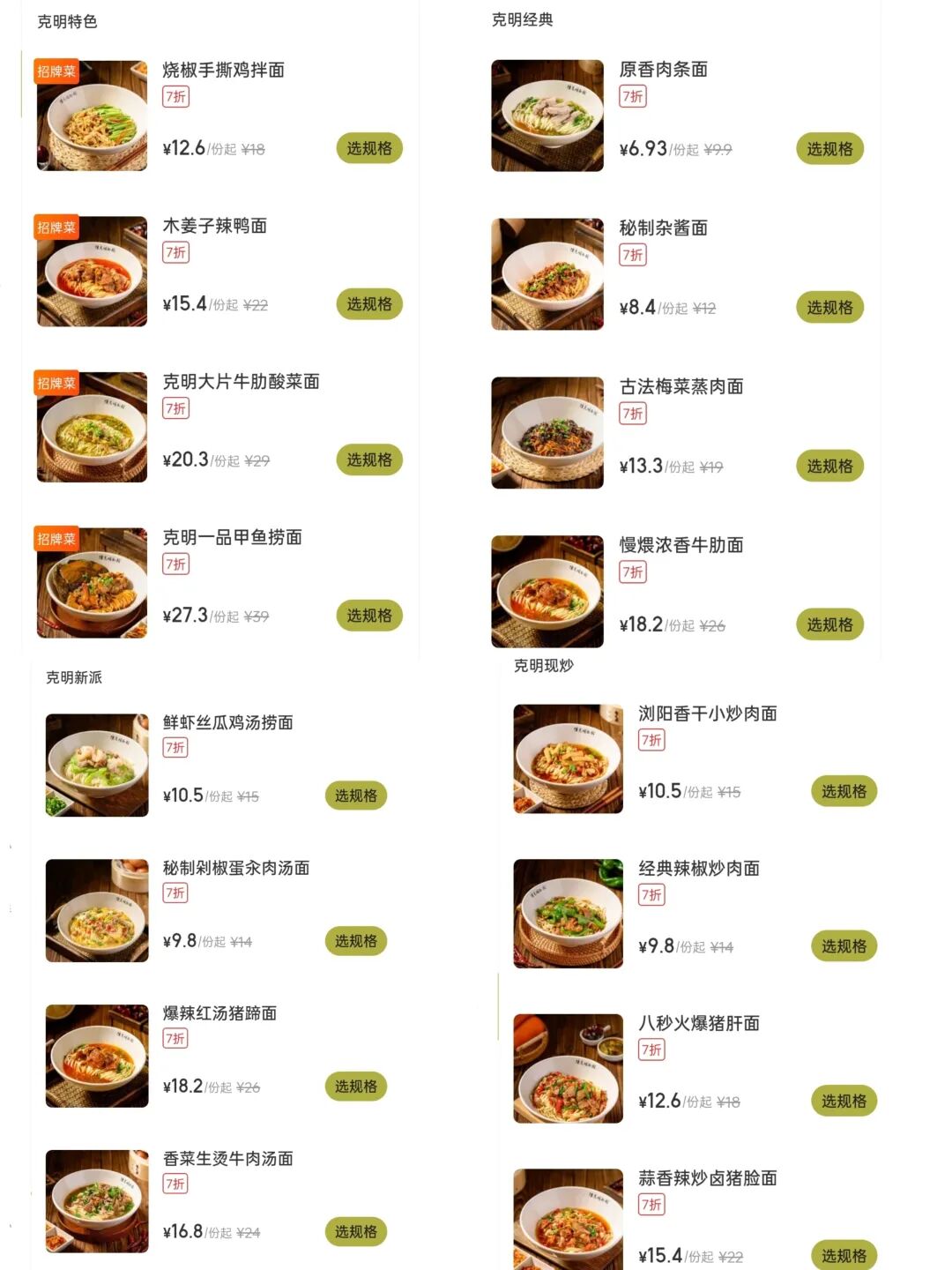 核心聚焦面条,总共划分出 “克明特色”“克明经典”“克明新派”“克明现炒” 四大系列,基本能覆盖从传统口味到创新融合的消费需求。
