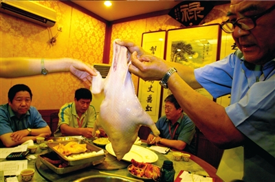 最让人啧啧称奇的却是曲园酒楼、烤肉宛、鸿宾楼等老字号厨师表演的整鸭脱骨,整个过程犹如庖丁解牛一般将鸭肉剔离骨头后,鸭皮丝毫无伤,将整只鸭子重新摆好后,将水倒入,一滴不漏。