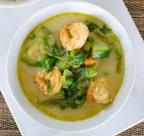 青色咖喱中有芫茜和青柠皮,所以呈现绿色,它与大虾搭配极佳。