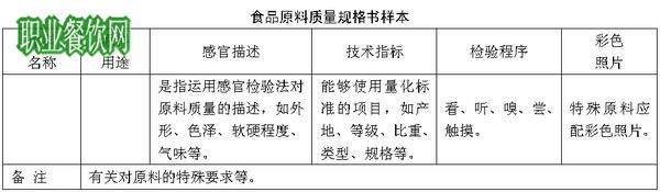 有些重要的食品原料或价格昂贵的原料,为了避免采购中的盲目性或难以把握,就应编制较为详细的食品原料质量规格书,以便在规格书中对原料的各项质量内容进行详尽的规定,详细食品原料质量规格书的样本格式如下所示。