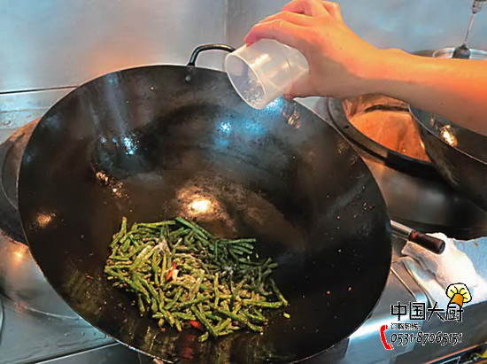 2、放入长豆角小火煸炒至水分全干,加鸡精、盐翻匀出锅即可。