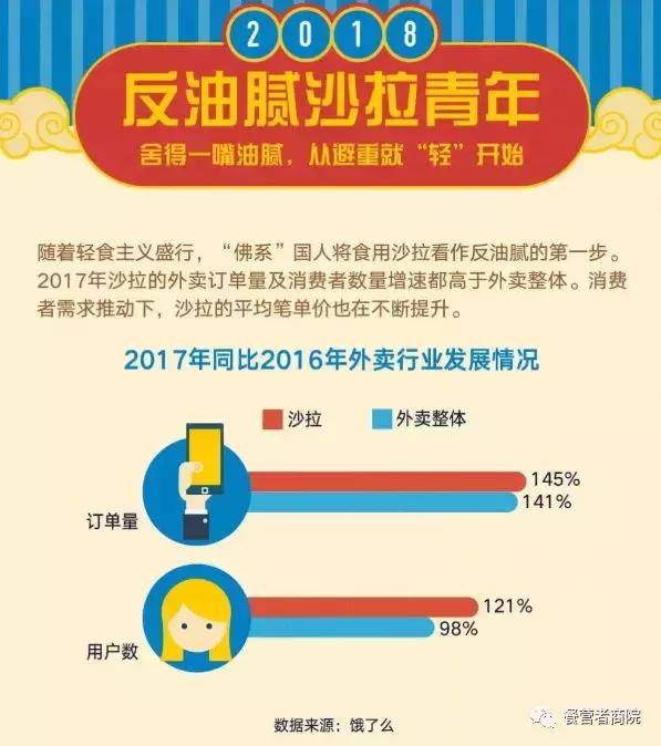 老规矩,新年伊始多展望。本篇以第一财经商业数据中心联合口碑,基于口碑、阿里、淘票票、饿了么等数据发布的《2018生活消费趋势报告》(CBNData),截取与餐饮业相关的部分来分析,为餐营者们的经营方向出谋划策。
