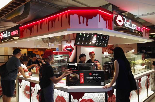 上海红唇串串香则用了极具诱惑力的夸张符号,把有水的麻辣烫改干拌麻辣烫后成为了麻辣烫界的当红“炸子鸡”……